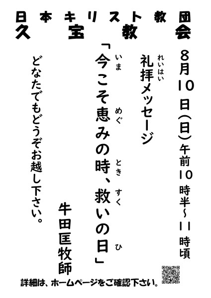 ホーム > お知らせ お知らせ内容 8月10日 礼拝予告 2025/08/05(火) 2025年8月10日 礼拝予告です聖書 コリントの信徒への手紙Ⅱ 5章14節-6章2節メッセージ「今こそ恵みの時、救いの日」牛田匡牧師 <<戻る