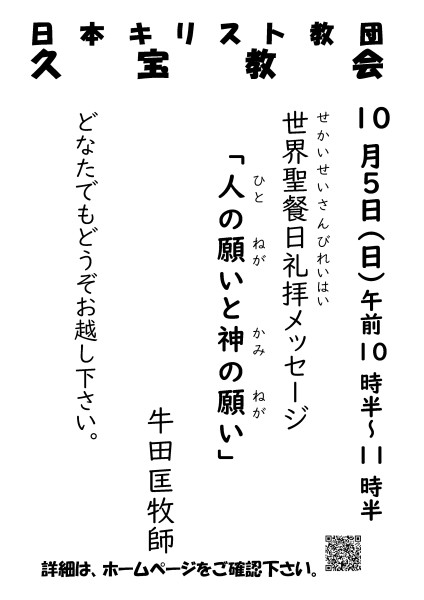 ホーム > お知らせ お知らせ内容 10月5日 世界聖餐日礼拝予告 2025/09/29(月) 2025年10月5日の世界聖餐日礼拝予告です。聖書 マタイによる福音書 19章 16-30節メッセージ「人の願いと神の願い」牛田匡牧師 <<戻る