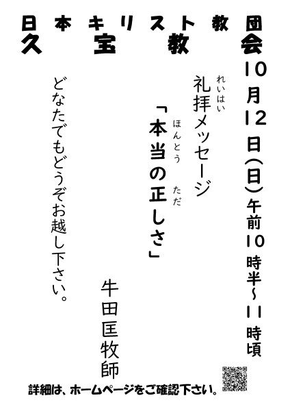 ホーム > お知らせ お知らせ内容 10月12日 礼拝予告 2025/10/06(月) 2025年10月12日の礼拝予告です聖書 マタイによる福音書 20章1-16節メッセージ「本当の正しさ」牛田匡牧師 <<戻る