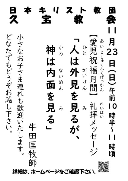 ホーム > お知らせ お知らせ内容 11月23日 礼拝予告 2025/11/17(月) 2025年11月23日の礼拝予告です。聖書 サムエル記 上 16章 1-13節メッセージ「人は外見を見るが、神は内面を見る」牛田匡牧師 <<戻る