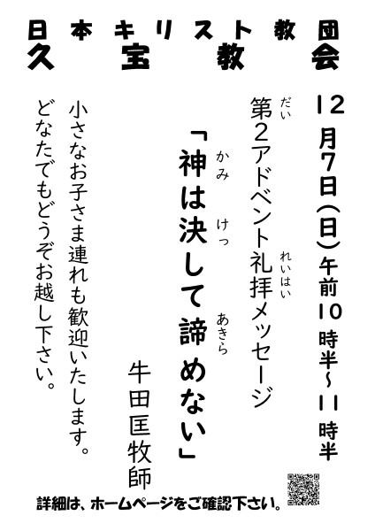 ホーム > お知らせ お知らせ内容 12月7日 礼拝予告 2025/12/04(木) 2025年12月7日の第2アドベント礼拝の予告です。聖書 エレミヤ書 36章 1-8、22-28節メッセージ「神は決して諦めない」牛田匡牧師 <<戻る