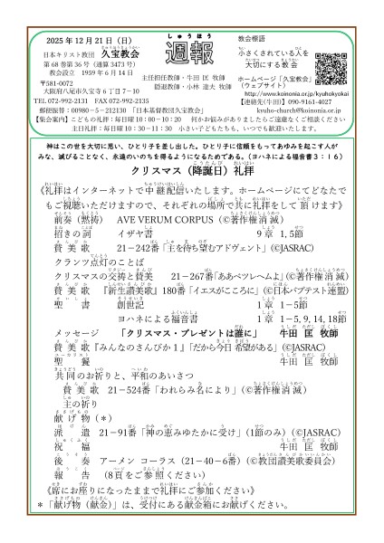 2025年12月21日のクリスマス礼拝のお知らせです。