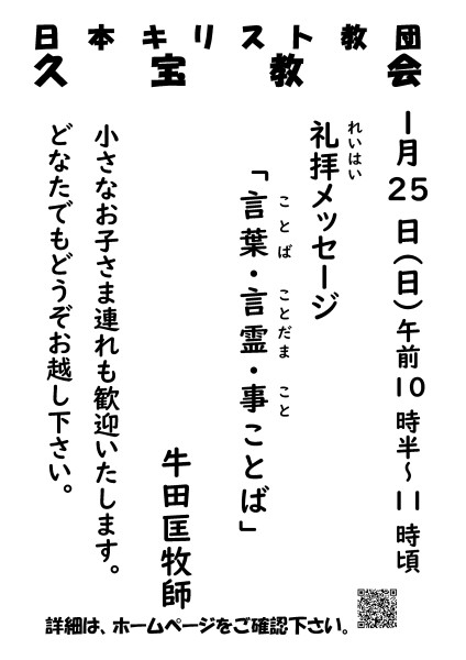 ホーム > お知らせ お知らせ内容 1月25日 礼拝予告 2026/01/19(月) 2026年1月25日の礼拝予告です。聖書 申命記 30章11-20節メッセージ「言葉・言霊・事ことば」牛田匡牧師 <<戻る