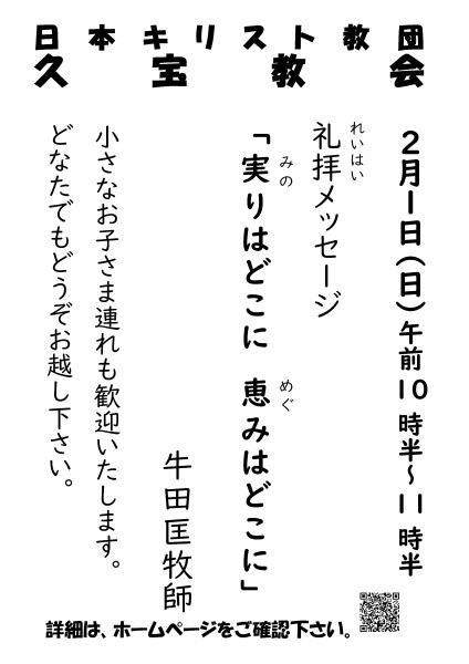 ホーム > お知らせ お知らせ内容 2月1日 礼拝予告 2026/01/25(日) 2026年2月1日 礼拝予告です聖書 マルコによる福音書 4章 1-9節メッセージ「実りはどこに 恵みはどこに」牛田匡牧師 <<戻る