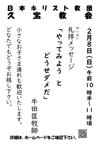 ホーム > お知らせ お知らせ内容 2月8日 礼拝予告 2026/02/02(月) 2026年2月8日 礼拝の予告です聖書 マルコによる福音書 2章1-12節メッセージ「やってみようと、どうせダメだ」牛田匡牧師 <<戻る